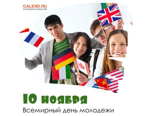 Всемирный день молодежи отмечается 10 ноября в честь основания Всемирной Федерации Демократической Молодежи (ВФДМ). Праздник был учрежден в 1945 году, после окончания Второй Мировой войны, и был направлен на объединение усилий молодежных организаций в борьбе за мир, демократию, национальную независимость и в защиту прав и интересов молодежи.