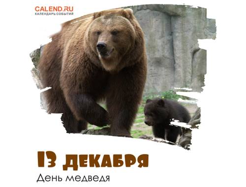 13 декабря медведь окончательно устраивается в берлоге на зимнюю спячку. В этот день в России отмечается День медведя, являющегося национальным символом страны. Медведь почитается множеством народов, его уважали в славянской культуре. Он — один из основных персонажей русских сказок и просто красивое, сильное и умное животное, один из крупнейших хищников суши. По поверьям, характер медведя весьма схож с человеческим. Настоящее имя животного было нельзя называть вслух, чтобы не навлечь на себя беду, поэтому использовали заместительные названия: косолапый, хозяин леса, потапыч. Любопытно, что слово «медведь» тоже является заместительным названием.