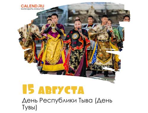 День рождения Республики Тыва отмечают 15 августа. Столица республики — город Кызыл, и, согласно действующей Конституции республики, наименования «Республика Тыва» и «Тува» считаются равнозначными.