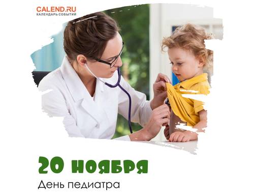 20 ноября отмечается День педиатра. Педиатр — это детский врач, который наблюдает за ребенком с первых дней жизни и до 18 лет. Работа педиатра заключается не только в непосредственной заботе о здоровье ребенка, но и в информировании родителей об особенностях детского организма. Самым важным в работе педиатра является врачебный опыт, и конечно, умение найти подход к детям и их родителям. Многие педиатры запоминают своих подопечных на долгие годы, и родители детей тоже запоминают хорошего педиатра надолго. В этот праздничный день проводятся мероприятия по обмену врачебным опытом и медицинскому просвещению в области педиатрии.