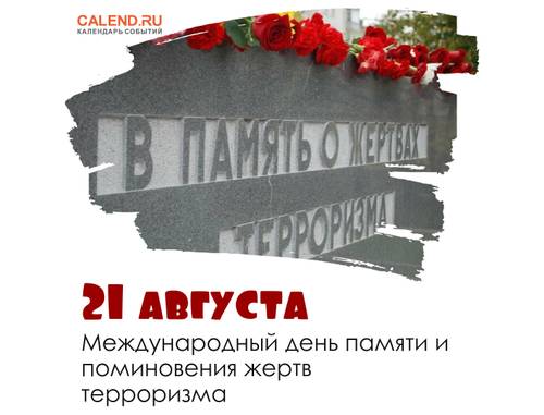 Международный день памяти и поминовения жертв терроризма отмечается 21 августа. Терроризм всегда был и остается огромной проблемой для всего общества. Любые акты терроризма, чем бы они ни были мотивированы и где бы, когда бы и кем бы они ни совершались, являются тягчайшими преступлениями и не имеют оправдания. Пострадавшим от терактов людям и семьям жертв требуется поддержка и помощь, чтобы они могли вернуться к нормальной жизни, и этот день призывает к решению этой проблемы на государственном уровне.