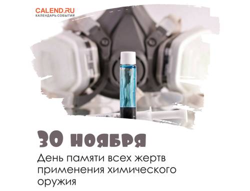 30 ноября проходит День памяти всех жертв применения химического оружия, который отмечается с 2006 года. Химическое оружие является оружием массового поражения, масштабно его начали применять более 100 лет назад, в годы Первой Мировой войны, и с развитием разработок в области отравляющих веществ оно могло бы стать еще одним видом «оружия апокалипсиса», однако человечество спасает тот факт, что химоружие является ненадежным и сложным в применении и дорогостоящим в хранении боеприпасов. Использование химоружия в военных целях было запрещено Женевским протоколом 1925 года. Позже, в ходе принятия других международных соглашений, в 1992 году была принята Конвенция о запрещении химического оружия, согласно которой, страны-участники обязаны полностью уничтожить все запасы своего химоружия. Россия справилась с этой задачей в 2015 году.