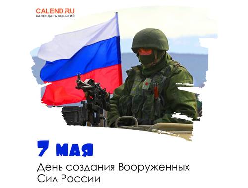 День создания Вооружённых Сил России отмечают 7 мая. В этот день в 1992 году Б.Н. Ельцин подписал указ о «О создании Вооруженных Сил Российской Федерации». Главная задача ВС — защита целостности и неприкосновенности нашей страны. ВС РФ — одни из самых крупных вооружённых сил мира, и являются преемником боевой славы, опыта и лучших традиций ВС СССР, наследником традиций и побед русской армии и флота.