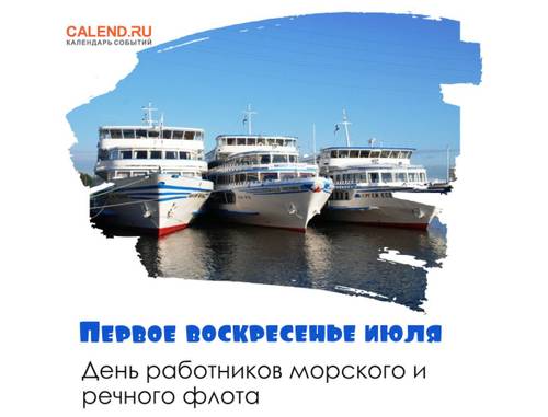 День работников морского и речного флота отмечается ежегодно в первое воскресенье июля. Этот профессиональный праздник выражает уважение к труду работников гражданского флота, не прекращавшемуся и в годы войны, и в мирное время. Сегодня морской и речной флот РФ активно развивается и является одной из передовых отраслей экономики — по протяженности внутренние водные пути практически в два раза превышают федеральные автомобильные дороги, и большая часть из этих путей не имеет альтернатив по возможностям доставки грузов и пассажиров.