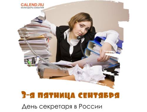День секретаря в России — пока еще неофициальный праздник — ежегодно отмечается в третью пятницу сентября. Секретарский чин появился в России в 1720 году благодаря Петру I, и первоначально эту должность могли занимать только мужчины, к которым предъявлялись весьма строгие требования. Одним из важных «попечений» царского секретаря являлось обеспечение сохранности документов. Его леность и недосмотр наказывались штрафами, а более серьезные проступки могли довести и до «лишения живота и пожитков».
