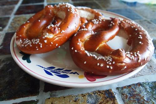 - Мед смешать с водой 1 к 1, смазать горячий крендель.