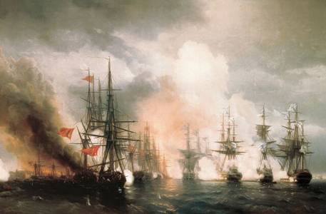 (18) 30 ноября 1853 года, наконец, подошло подкрепление. Теперь его эскадра состояла из шести линейных кораблей и двух фрегатов. Подойдя на расстояние 300-350 метров от турецких кораблей и бросив якоря, они открыли сокрушительный огонь по противнику. Стрельба русских кораблей отличалась высокой точностью и большим темпом.