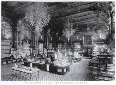 Открытие магазина состоялось (23 января) 5 февраля 1901 года. Всего в нем было пять отделов: колониально-гастрономических товаров, хрусталя Баккара, бакалейный, кондитерский и фруктовый. Кроме того, еще был винный погреб и производственные цеха (пекарня и пр.).