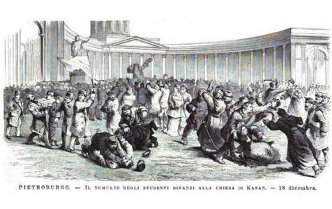 (6) 18 декабря 1876 года на Казанской площади в Петербурге состоялась первая в России политическая демонстрация (известная как Казанская демонстрация) с участием рабочих и студентов. Митинг был вызван ростом стачечного движения в стране. Демонстрация была организована и проведена народниками-землевольцами и связанными с ними членами рабочих кружков. На площади собралось около 400 человек.