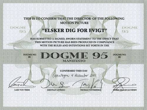В этих правилах Триер призвал снимать только на натуре и только ручной камерой, записывать вместе звук и изображение, не использовать комбинированные съемки и специальное освещение, не снимать сцены убийства, пользоваться пленкой формата 35 миллиметров и не указывать имя режиссера в титрах.