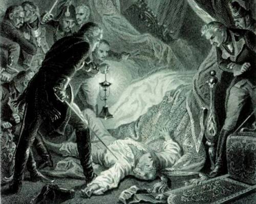 Российский император Павел I был (по одной из версий) задушен и забит офицерами в собственной спальне в ночь на (12) 24 марта 1801 года в Михайловском замке в Санкт-Петербурге.