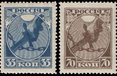 Еще в начале 1917 года, сразу же после отречения от престола императора Николая II, министерство почт и телеграфов Временного правительства приняло решение выпустить почтовую марку, олицетворяющую освобождение народа из оков царизма. На них художник Р.Г. Зарриньш изобразил руку с мечом, разрубающим цепь, и надписью «Россия».