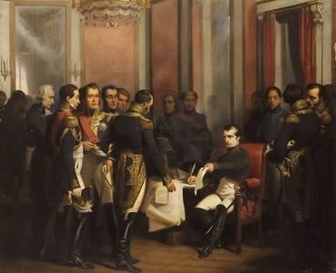 Согласование условий отречения продолжалось представителями России, Пруссии, Австрии, Венгрии и Богемии до 11 апреля 1814 года, когда был подписан Фонтенблоский договор — соглашение между Наполеоном Бонапартом и представителями Российской империи, Австрийской империи и Прусского королевства, в соответствии с которым союзники лишали Наполеона власти над Французской империей. Его наследникам также запрещалось претендовать на французскую корону.