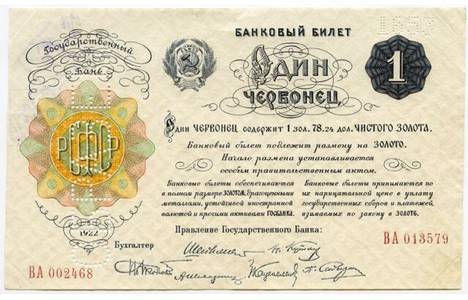 С 27 ноября 1922 года началось поступление в обращение банкноты номиналом в 1, 3, 5, 10 и 25 червонцев. На банкнотах было зафиксировано, что 1 червонец содержит 1 золотник 78,24 доли (8,6 грамма) чистого золота, и что «начало размена устанавливается особым правительственным актом».