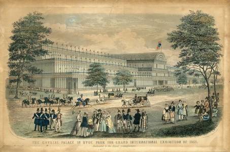 Хрустальный дворец был построен в лондонском Гайд-парке из железа и стекла как выставочный павильон к Первой Всемирной выставке 1851 года. Дворец площадью свыше 90 000 квадратных метров, протяжённостью 564 м и высотой до 33 м, выстроенный под руководством Пакстона, вмещал до 14 тысяч посетителей. Невиданная в викторианской Англии конструкция из стекла и железа имела грандиозный успех у посетителей выставки и жителей города.