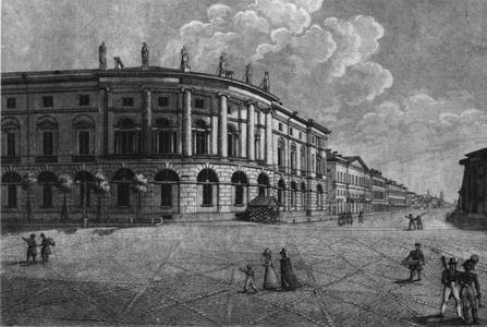 Тогда же Екатерина II высочайшим повелением одобрила представленный архитектором Е. Соколовым проект здания библиотеки, строительство которой началось в июне 1795 года. Это было первое в России здание, предназначенное именно для библиотеки. Место было выбрано в центре столицы, при пересечении улицы Сенной (Большой Садовой) с Невским проспектом, недалеко от императорского дворца и вблизи оживленного Гостиного двора.