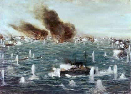 Это была последняя решающая морская битва Русско-японской войны 1904-1905 годов, в ходе которой русская эскадра была полностью разгромлена. Большая часть русских кораблей была потоплена японцами или затоплена экипажами своих кораблей, часть капитулировала, некоторые интернировались в нейтральных портах. И лишь четырем удалось дойти до русских портов.