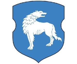 На голубом полотнище флага в центре серебряное изображение белого волка в полный рост.